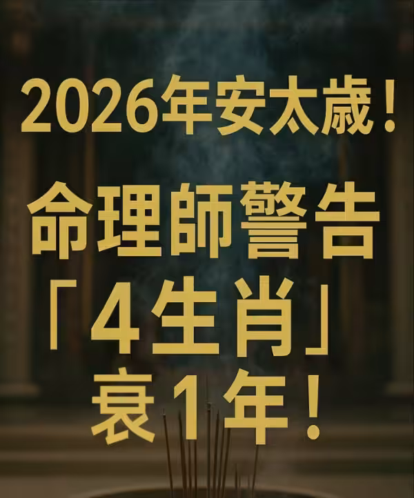 2026年是丙午年(馬年),命理師提醒,明年共有4個生肖犯太歲,運勢恐出現波動,不是衰整年,但越硬拼越容易出事,小心破財、情緒走山、人際摩擦、甚至健康亮紅燈。