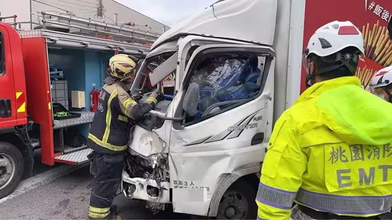 畫面中,砂石車緩緩向前移動,駕駛方向盤一轉,車頭左轉直行,但右方直行的小貨車根本來不及反應,「飛彈式」高速撞擊砂石車的車頭,由於衝撞力道過大,小貨車整台車從路面彈起後又落下,湯姓駕駛一度受困於座位上,救護人員到場時將人拉出,湯男腳部骨折及多處擦挫傷,送往長庚醫院救治。