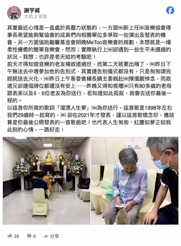 對於摯友過世、無法親自送別,謝宇威感到十分遺憾,只能以一同創作的〈溜漂人生夢〉歌詞,希望楊政道了無牽掛地離開,「謹以這首歌懷念你,應該算是你最後公開發表的一首歌曲吧!