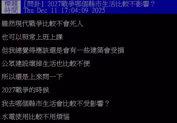 社群平台上近期掀起熱烈討論,話題圍繞著「戰時哪裡最安全」,引髮網友熱烈回應。
