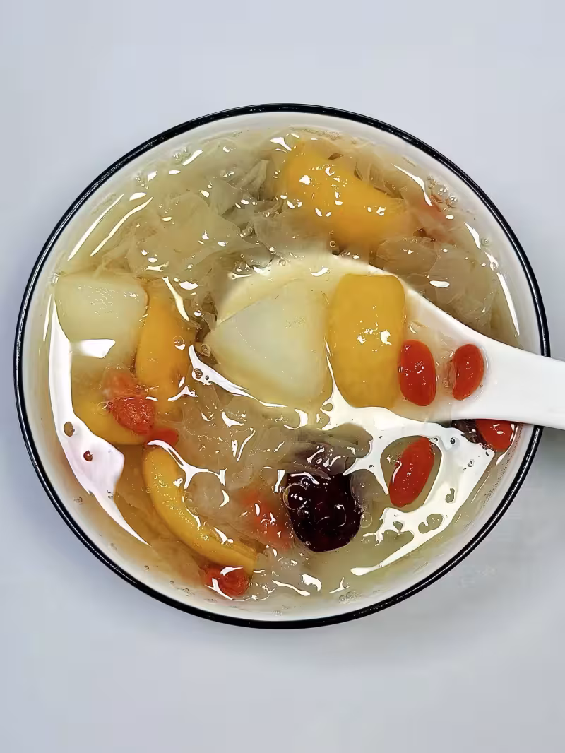 一上桌我媽就湊過來聞:「這味兒聞著就潤!」 老公更積極,拿著勺子就等開吃。這碗雪梨枇杷銀耳甜湯看著黃澄澄的,銀耳糯得拉絲,雪梨和枇杷浮在上面,光瞅著就暖乎乎的,喝一口直接從嗓子潤到胃裡,那乾燥勁兒「唰」一下就沒了!