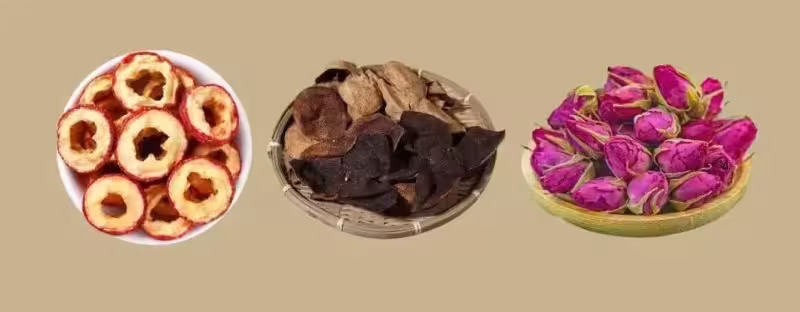 山楂+陳皮+玫瑰花:促進消化,健脾㾀濕,適合吃肉比較多,容易生濕的寶。