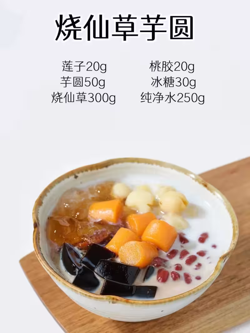 燒仙草切塊鋪底,搭配煮熟芋圓與蓮子,桃膠提前泡發後加入,淋上冰糖水。清涼潤喉,解熱降火。