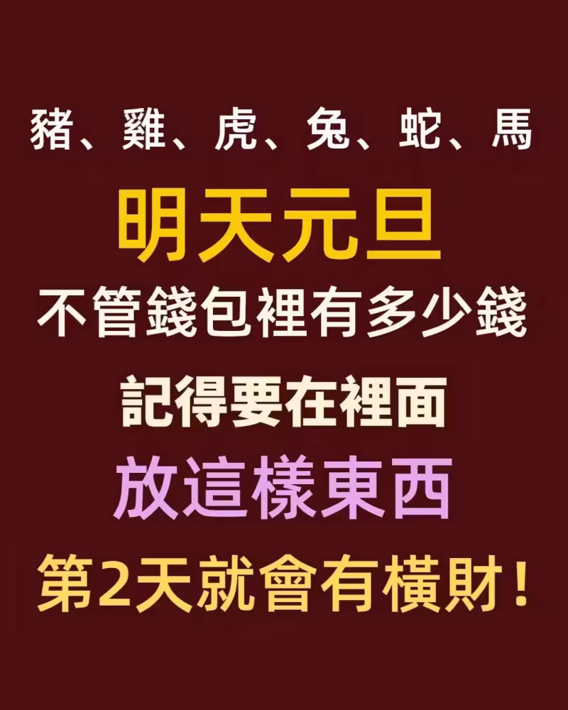「豬、雞、虎、兔、蛇、馬」元旦,不管錢包里有多少錢,記得要在裡面放這樣東西, 第2天就會有橫財!