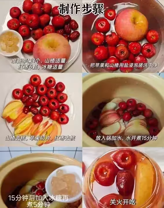 蘋果1個、山楂15-20顆、紅棗6顆,加冰糖調味即可。先把蘋果和山楂用鹽浸泡5-10分鐘,仔細搓洗乾淨;山楂去核、蘋果去皮切片、紅棗去核去核。鍋中加1000-1200ml清水,所有食材下鍋,大火煮開後轉小火慢煮15分鐘,最後加冰糖再煮5分鐘,一碗清甜溫潤的暖飲就做好了。這碗暖飲能溫和促進腸胃蠕動,化解積食腹脹,幫著化開體內淤堵的氣血。