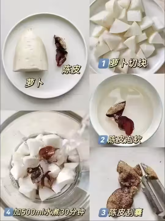 1. 白蘿蔔洗凈,不用去皮,切成細絲或薄片。陳皮用清水稍微沖洗一下。