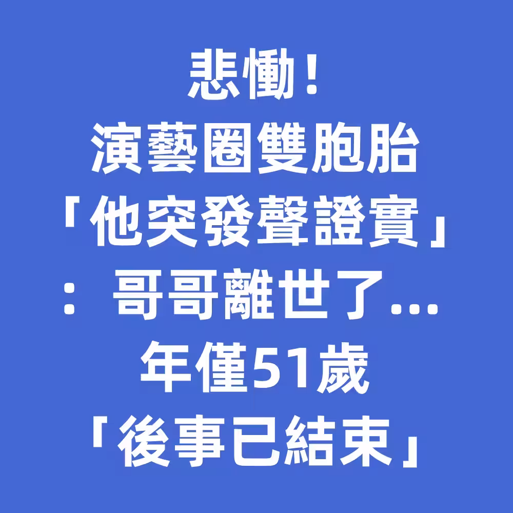 演藝圈悲慟!!! 演藝圈雙胞胎「他突發聲證實」:哥哥離世了... 年僅51歲「後事已結束」