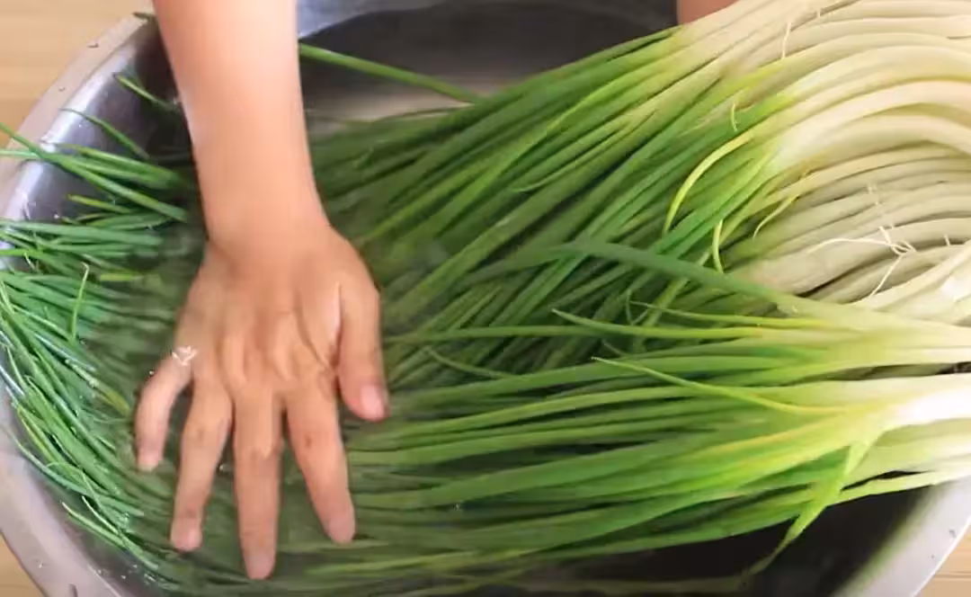 再把蔥葉拿來過一下水,然後就可以拿出來了,可以看到現在就非常的乾淨了。