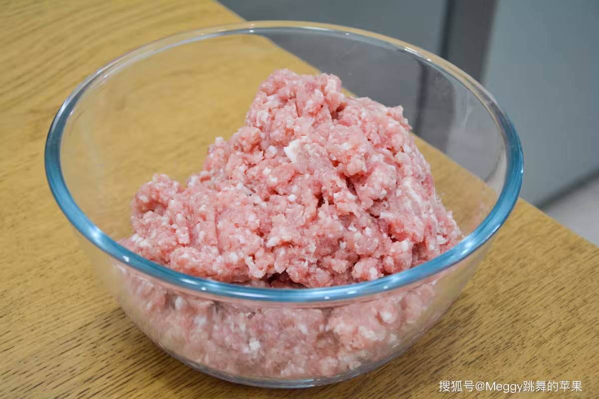 7. 豬肉用絞肉機攪打成小顆粒狀,這樣既細膩又有口感;