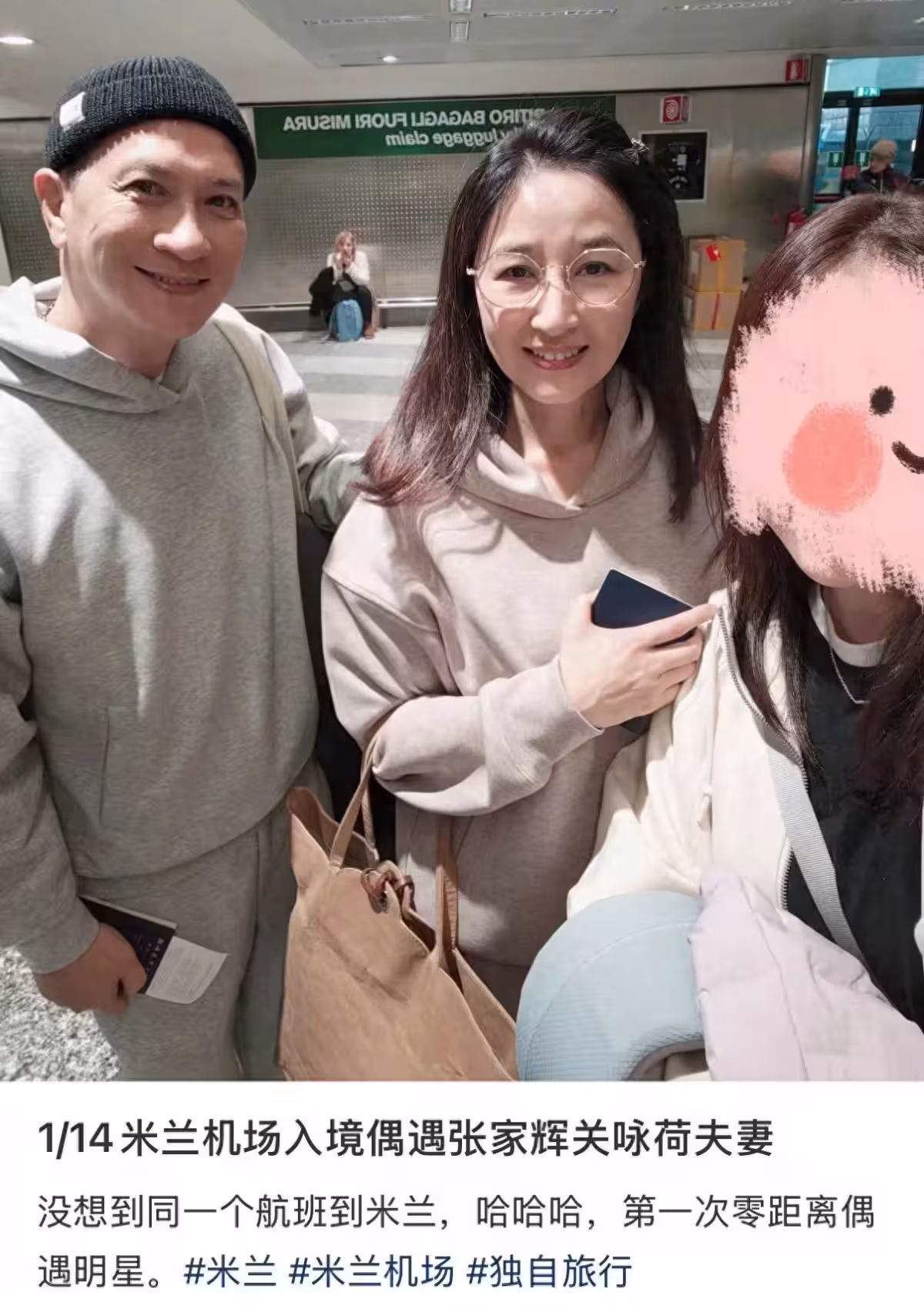 1月15日凌晨,有網友曬出在米蘭機場偶遇張家輝關詠荷的照片,並曬出合影,張家輝夫婦二人穿著情侶裝,看起來恩愛甜蜜似熱戀中的年輕小情侶。