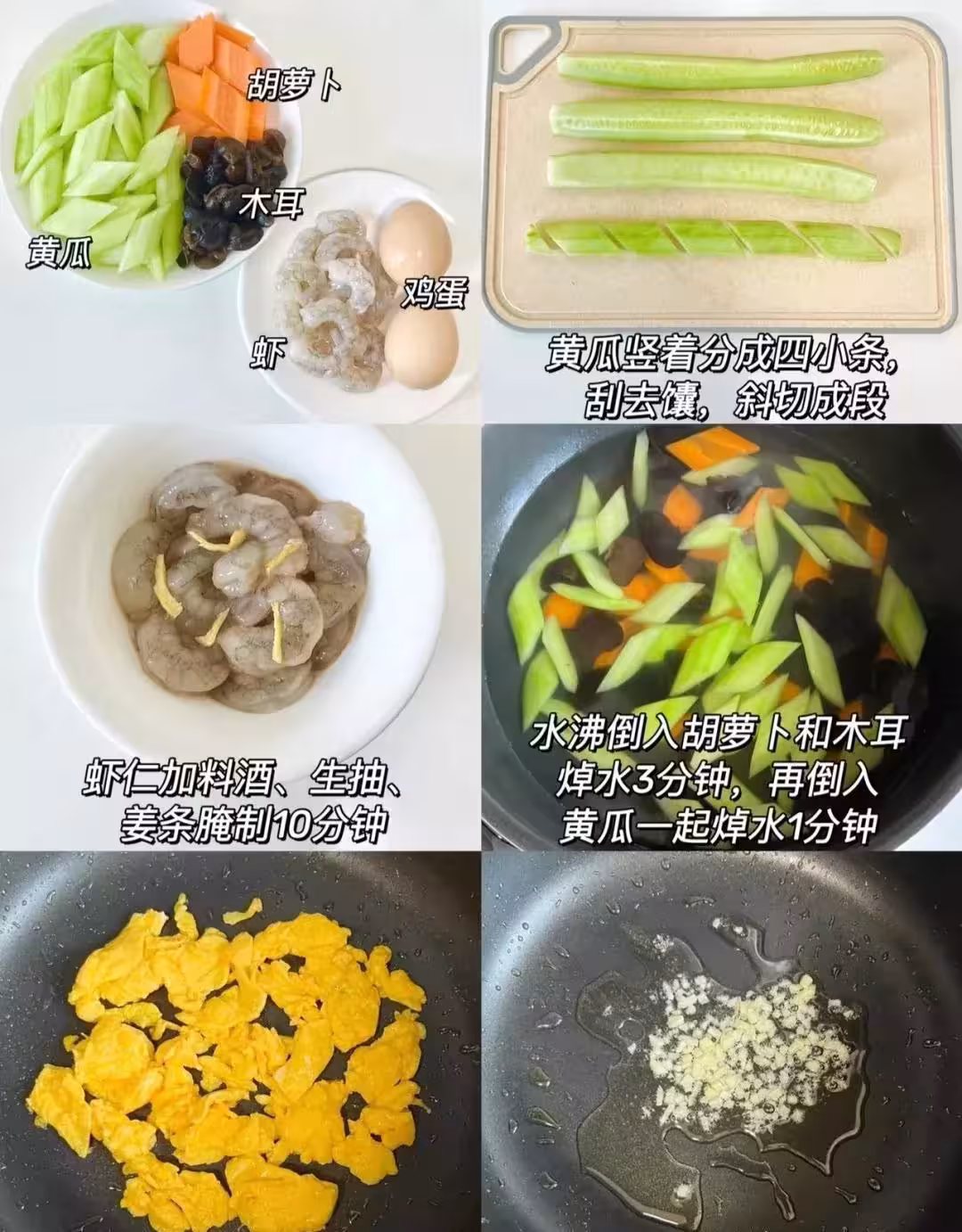 ⑤熱油炒香蒜末,倒入蝦仁炒熟,然後倒入黃瓜,胡蘿蔔,木耳翻炒均勻,倒入雞蛋,加入適量鹽,生抽,蚝油,雞精,翻炒均勻入味即可。