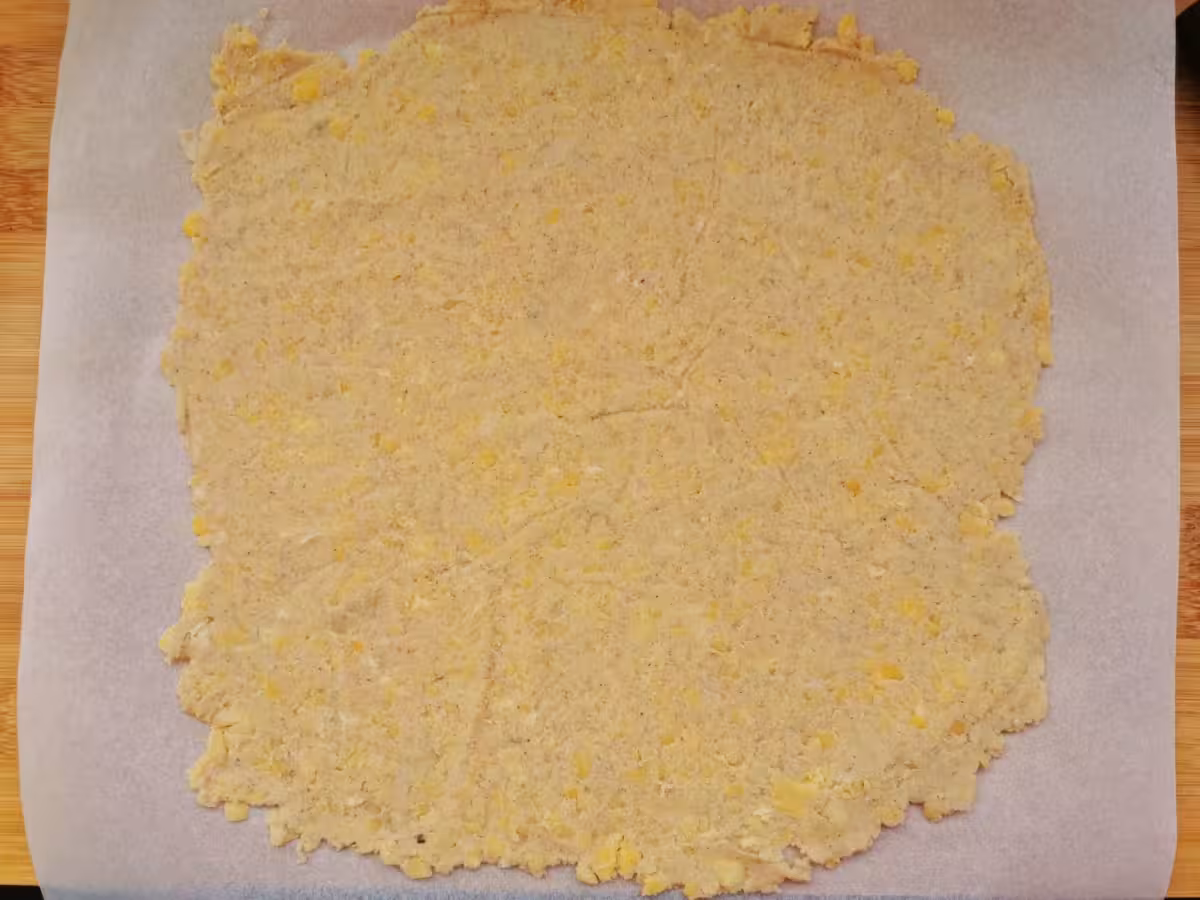 5、取一些麵糰鋪在油紙上,上面再覆蓋一張油紙,擀成均勻的薄片。
