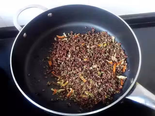 4、當香料水分炒干後,我們倒入鹽,繼續用小火來炒,炒到食鹽有點略微發黃就可以熄火了