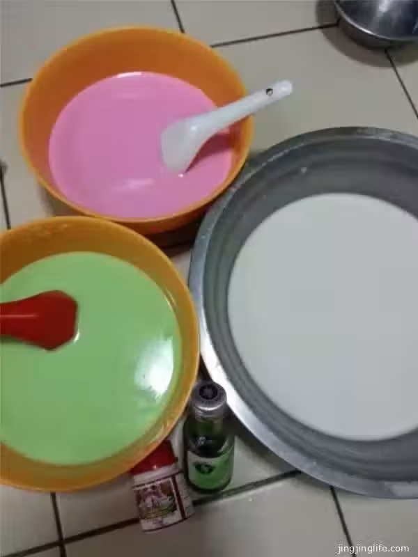 3)準備一個已經塗上適量食油的9寸蒸盤,先入蒸爐餘熱3分鐘。然後倒入一小碗麵糊,以最小火蒸5分鐘,再加上兩一種顏色麵糊,繼續蒸5分鐘。