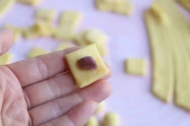 4、取一個小正方形麵糰包入1個花生米,包好後搓圓即可;