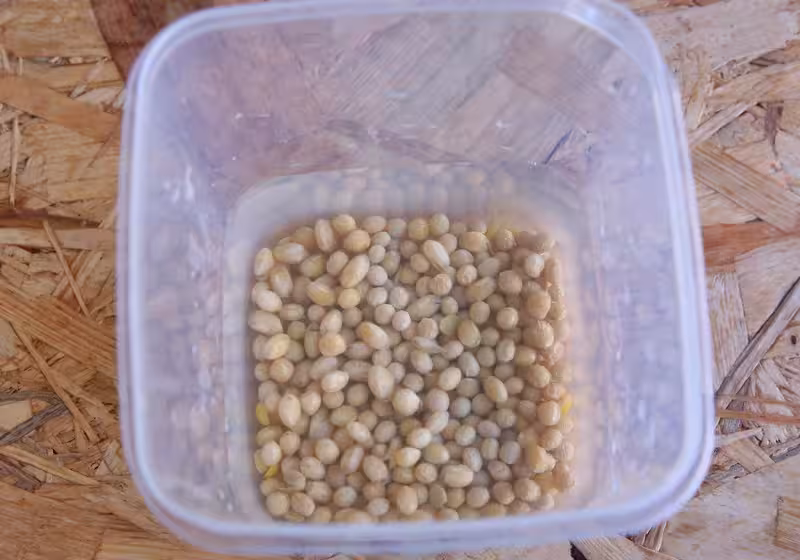 黃豆瀝干後浸泡於2,000c.c.常溫水中。