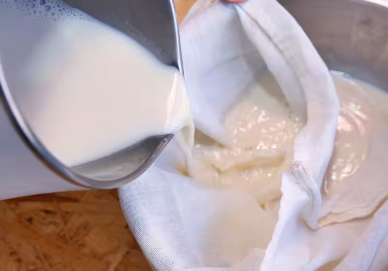 備一鍋,放入濾巾,將做好的豆漿與豆渣一起倒入濾巾,讓豆漿經過濾流入鍋內,並靜置室溫放涼,濾巾內的豆渣倒掉。