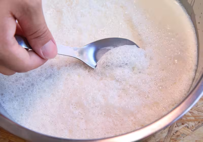 再用湯匙將頂部的泡泡刮除,接續放涼20分鐘。