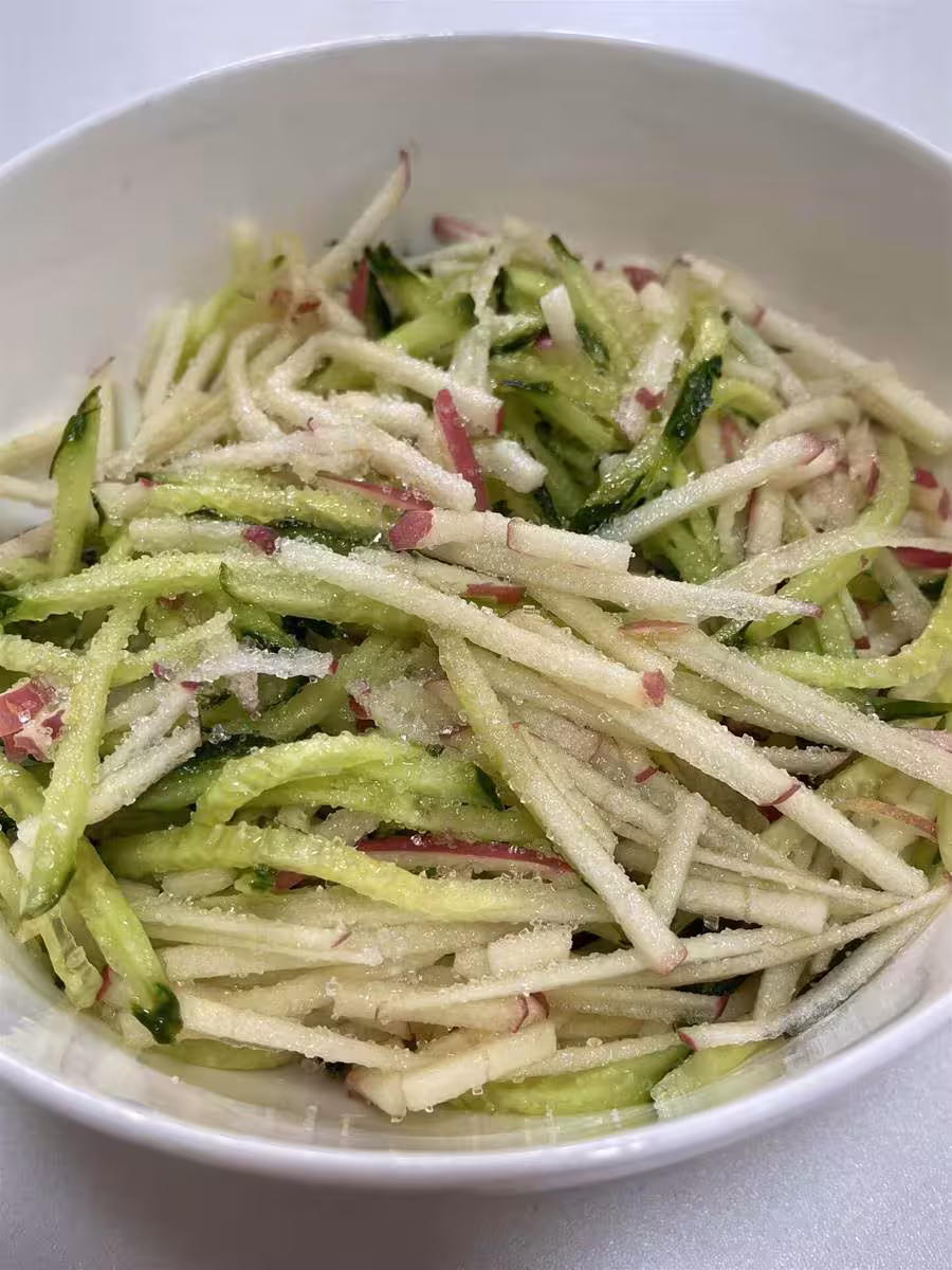 在混合蘋果和黃瓜後,輕輕攪拌均勻,讓糖分充分融入到水果和蔬菜中。
