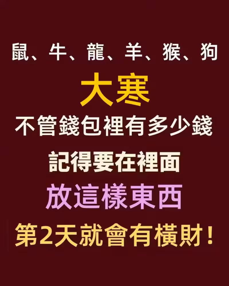 「鼠、牛、龍、羊、猴、狗」大寒,不管錢包里有多少錢,記得要在裡面放這樣東西,第2天就會有橫財!