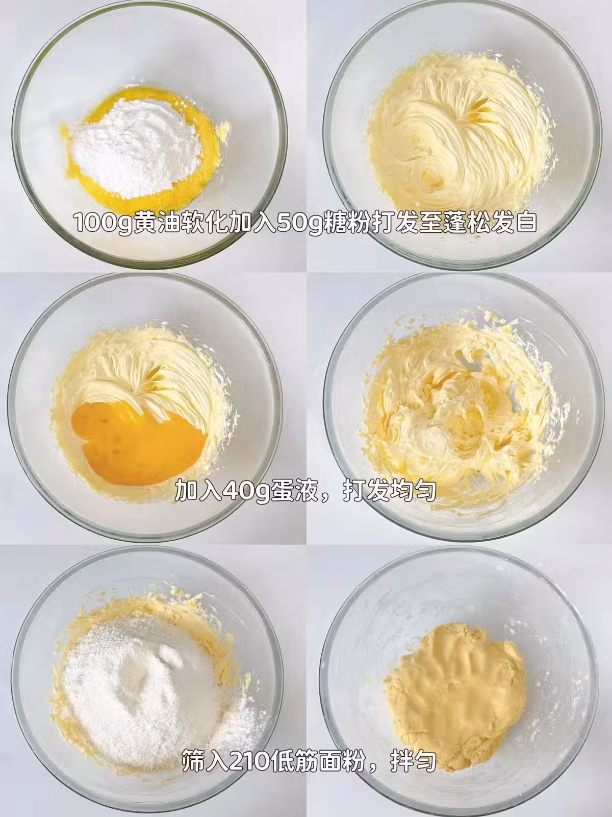 2、製作酥皮,黃油軟化加入糖粉打發至蓬鬆發白,加入蛋液,攪打均勻,篩入低筋麵粉,拌勻