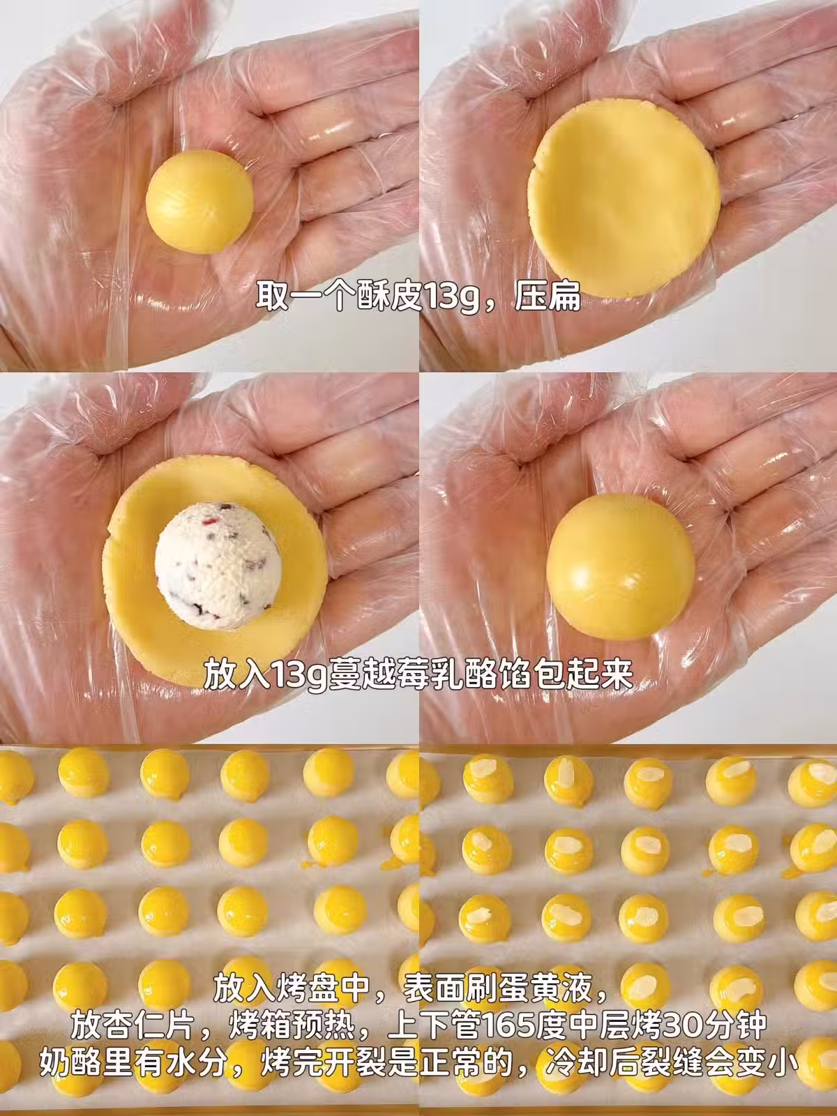 3、取一個酥皮13g,壓扁,放入13g蔓越莓乳酪餡包起來