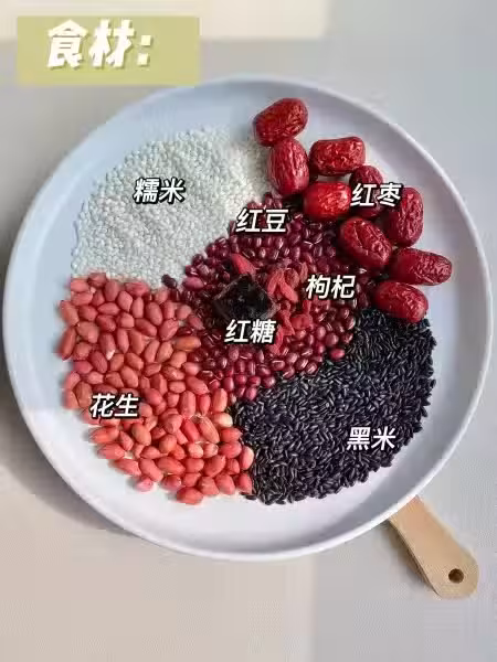 用的食材是:花生,黑米,紅糖、枸杞,紅豆、紅棗、糯米、牛奶。(基本都是一比一的比例)