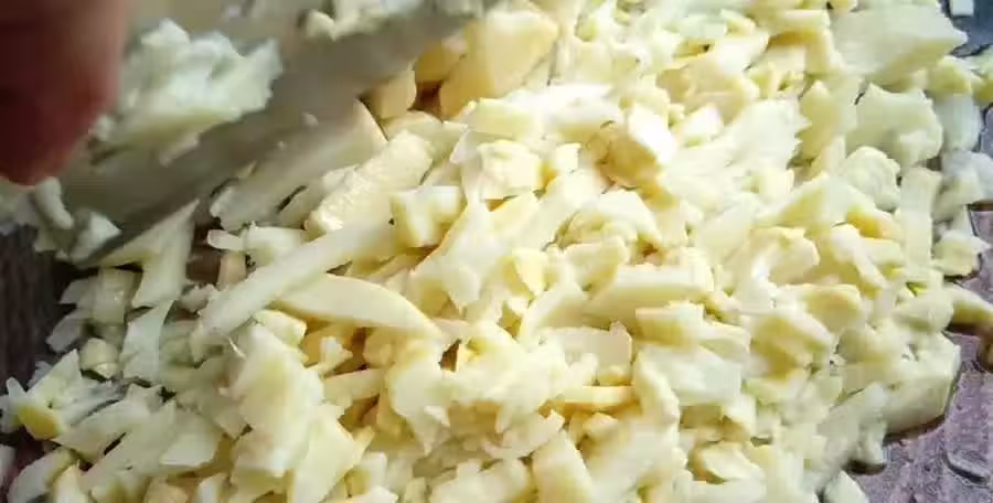 第一步:準備一些新鮮的竹筍,現在市場上應該有很多賣了,大家可以買那些直接可以下鍋炒的新鮮筍片,稍微清洗一下就可以切碎備用了
