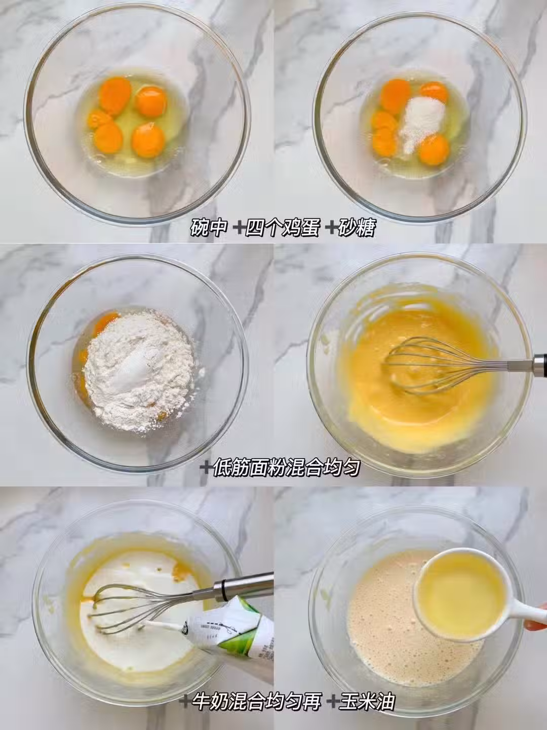 1.碗中➕雞蛋➕砂糖➕低筋麵粉混合均勻➕牛奶➕玉米油混合均勻靜止20分鐘備用
