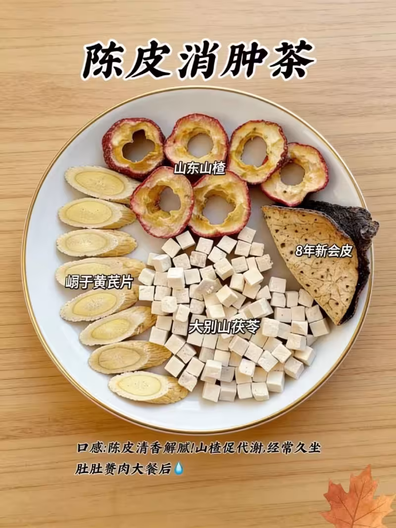 我屬於久坐黨,每天對著電腦一坐就是七八個小時,下班回家小腿經常是腫的,按下去一個坑好久才彈起來,這個茶是專門針對水腫體質的,山楂干5克、陳皮4克、茯苓5克、黃芪5克,煮水喝效果更好,我都是晚上回家煮一壺,小火燉15分鐘左右。