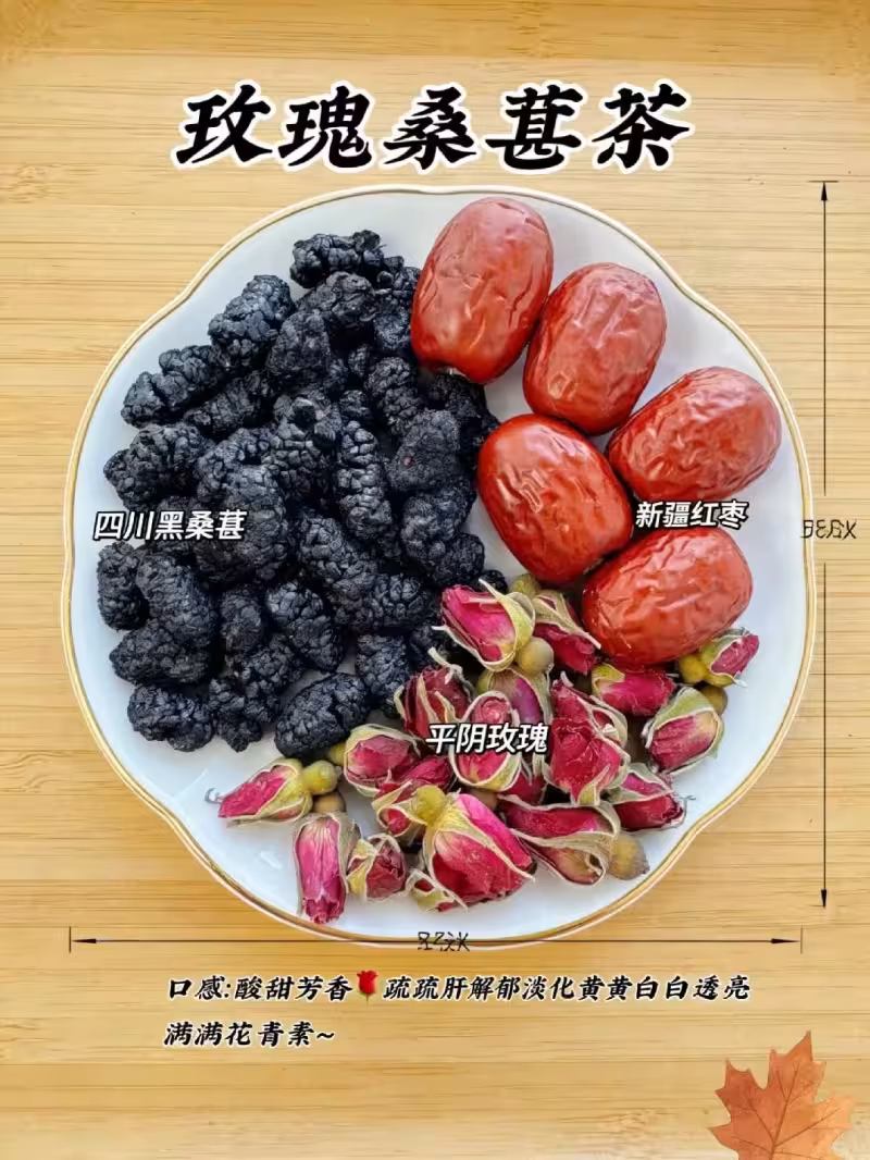 這個是顏值最高的一款,泡出來顏色特別漂亮,紫紅色的很好看,平陰玫瑰5克、黑桑葚干5-6顆、紅棗2顆去核,熱水一衝就行,桑葚的花青素含量很高,對皮膚抗氧化挺好的,玫瑰疏肝解郁,我每次壓力大或者姨媽期前後都會喝。