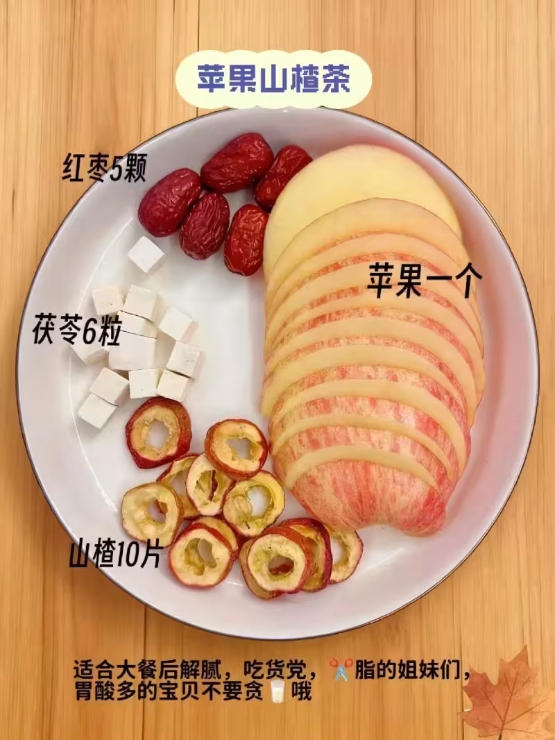 這個配方特別適合聚餐後或者吃多了油膩的時候喝,就是一個蘋果切片、山楂干10片左右、茯苓6塊、紅棗5顆,蘋果不用削皮直接切薄片就行,山楂和茯苓提前用溫水泡5分鐘,紅棗去核切兩半,全部丟進鍋里加水沒過食材,大火煮開轉小火燉20分鐘,煮出來是酸酸甜甜的味道,喝完肚子裡特別清爽,那種脹脹的感覺很快就消了,我上周末在外面吃了頓火鍋,回來煮了一壺喝,第二天早上起來腸胃就舒服多了。