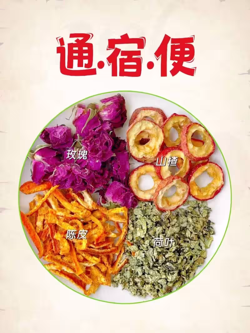 這款用玫瑰、山楂、陳皮和荷葉,玫瑰我用了四五朵,山楂切片10來個,陳皮撕成小塊一小把,荷葉掰一點就夠了,這幾樣東西都有理氣的作用,山楂消肉食,陳皮化濕氣,荷葉刮油,適合那種吃得油膩了便秘的人,水開了把這些丟進去煮15分鐘左右就行了,水的顏色會變成淡淡的琥珀色,喝著有點酸有點苦但不難喝,我老公喝了兩天說肚子輕鬆多了。