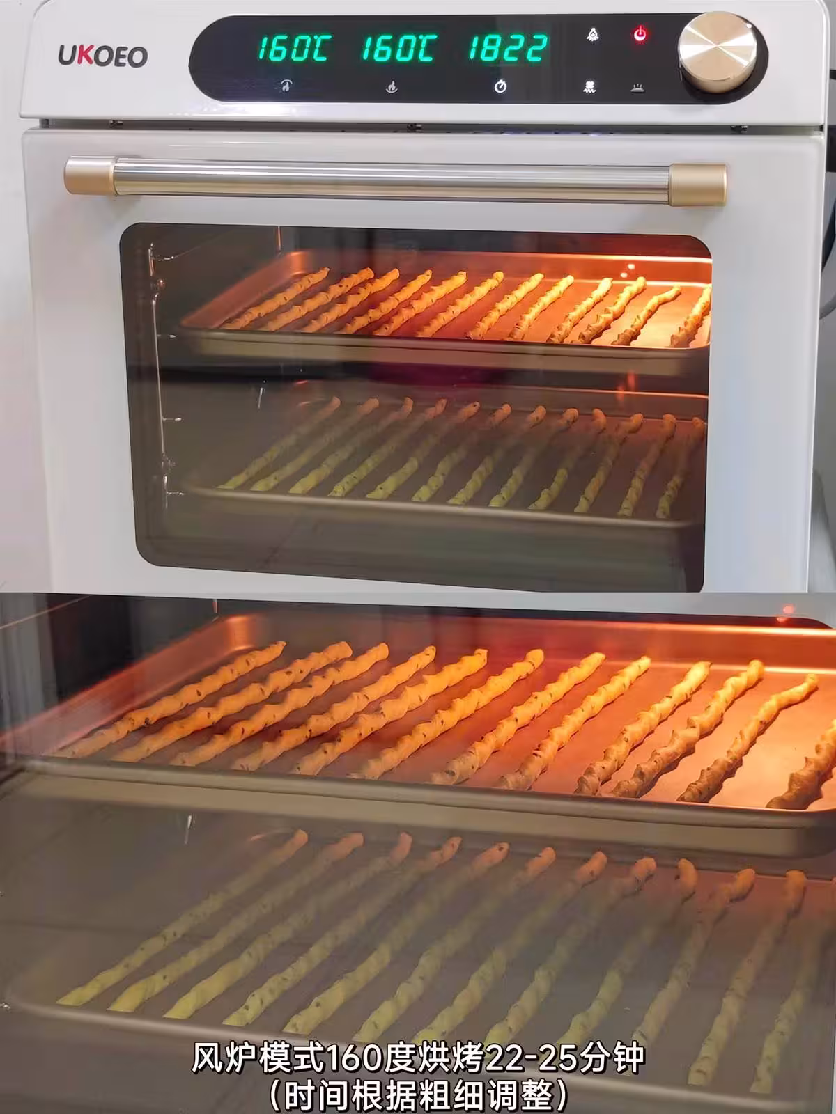 5️⃣依次做好放烤盤上,預熱好的烤箱,風爐模式160度烘烤22-25分鐘,時間根據粗細調整