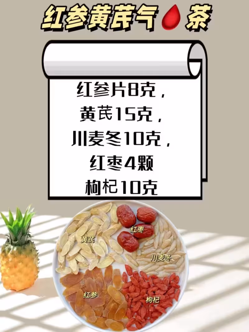 這款茶適合氣血不足、容易疲勞乏力的人群,紅參性溫,建議每周飲用2-3次,體質燥熱者可減少紅參用量或搭配菊花同煮。