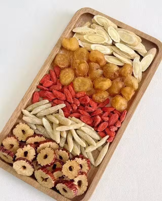 紅棗干6到8片 , 桂圓5顆 , 枸杞一小把 , 麥冬5到8粒。