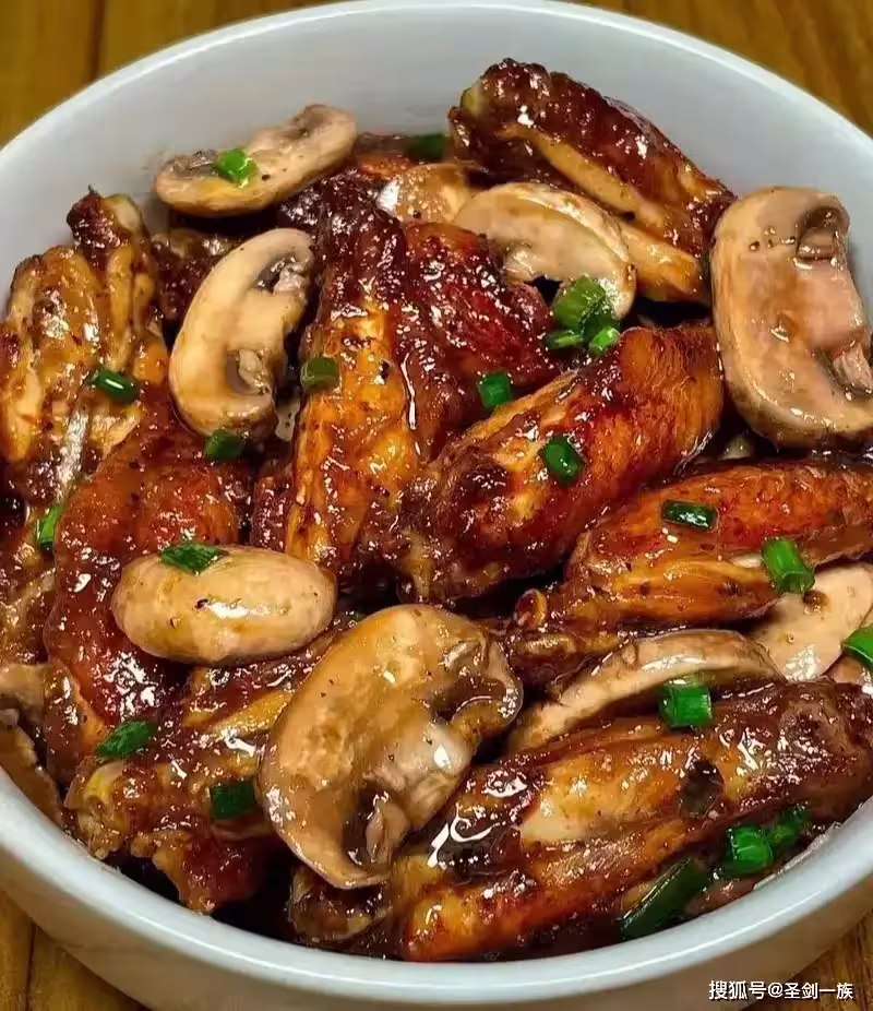 4、口蘑炒軟後,和雞中翅翻炒均勻,再倒入黑胡椒粉翻炒至入味,最後撒上蔥花就可以出鍋裝盤開吃了。