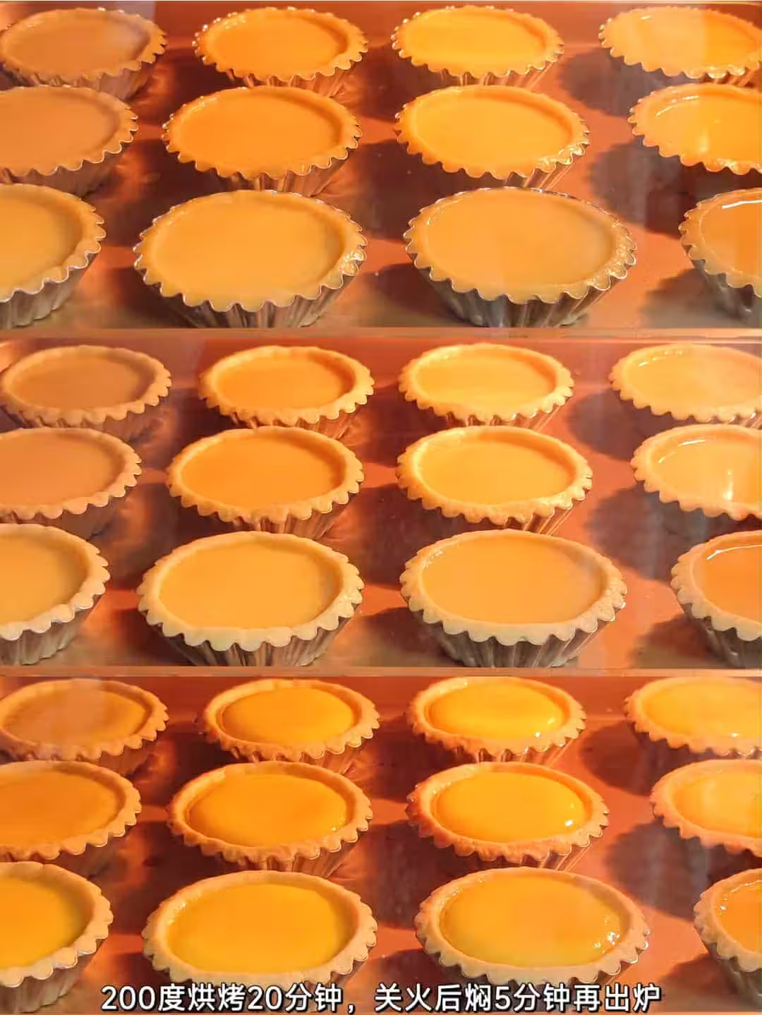 4⃣先預熱烤箱,預熱好了再把蛋撻水倒入撻皮里,避免撻水被撻皮吸收,上下火200度烘烤20分鐘,關火後燜5分鐘再出爐