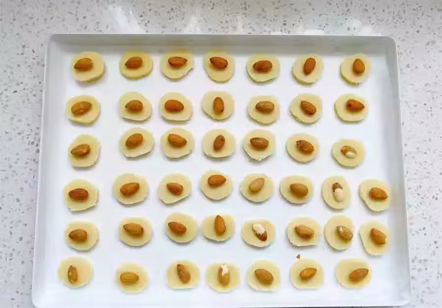 9、烤箱開始預熱,上下管160度,把切好圓片餅乾放入烤盤裡,鋪上一層,中間留出少許間距,餅乾中間放入一顆杏仁。