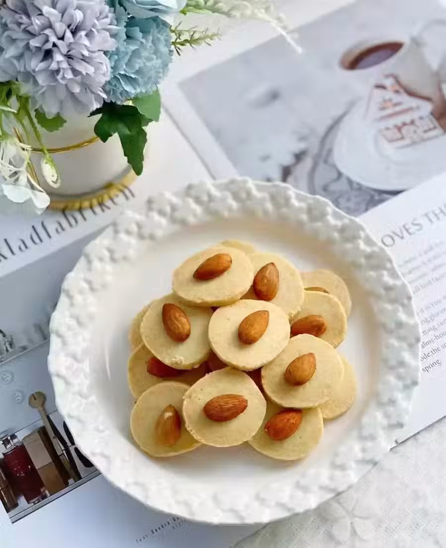【食材】:無鹽黃油100克,細砂糖40克,鹽1克,全蛋液18克,香草精1克,低筋麵粉175克,粗砂糖(表面)適量,杏仁(表面)適量