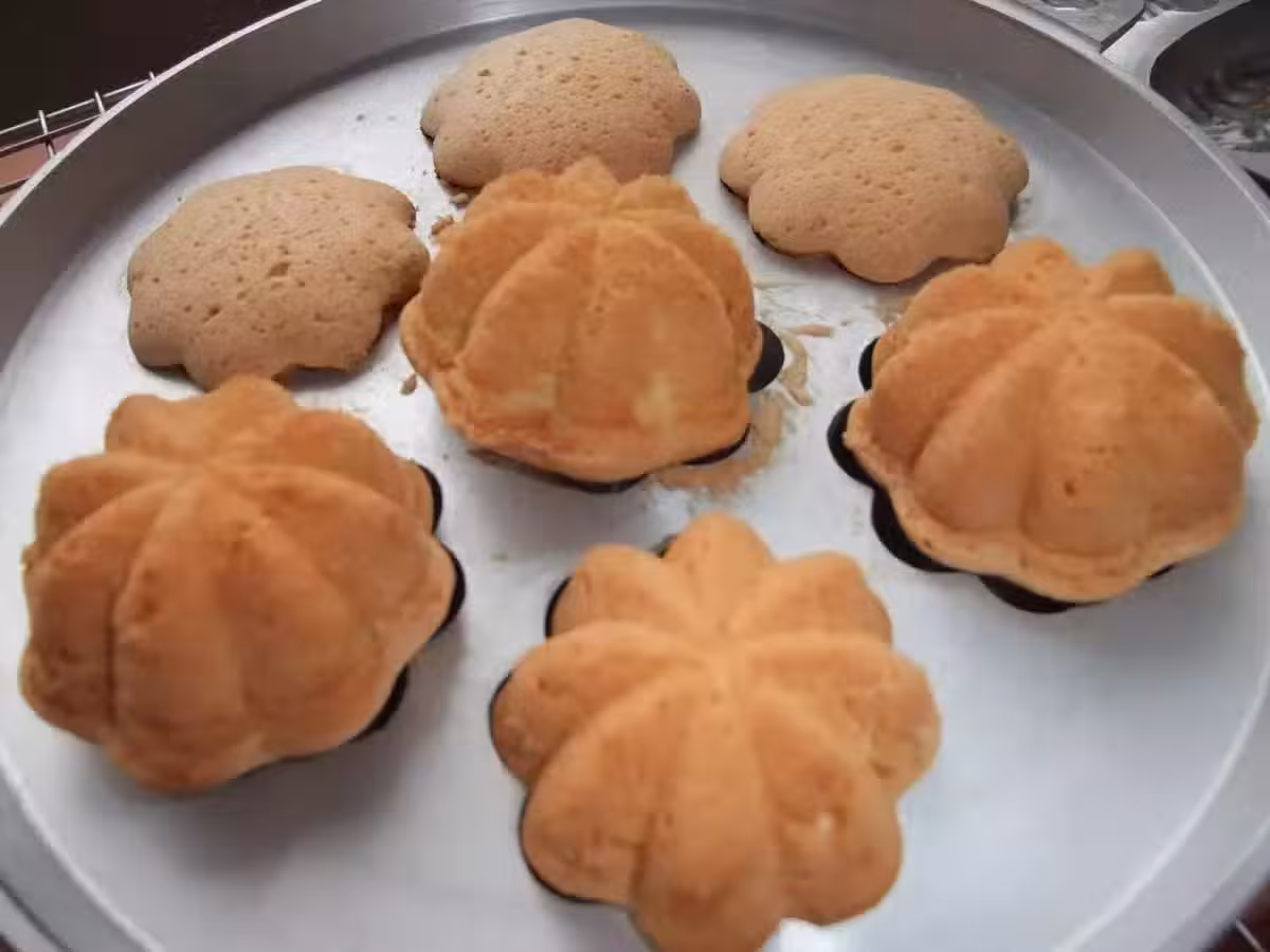 預熱雞蛋糕模型,塗上少許的油,將麵糊放入擠花袋,把麵糊按入模子裡8分滿