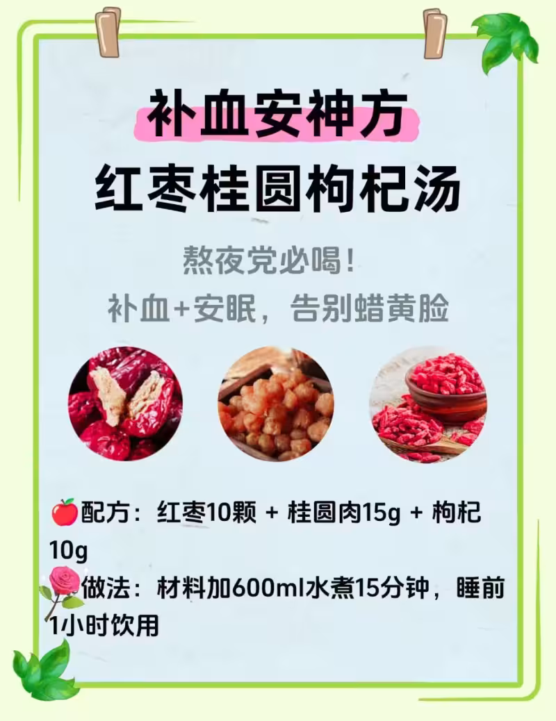 ✅ 做法:紅棗+桂圓加水煮20分鐘,最後5分鐘放入枸杞,燜煮片刻即可。