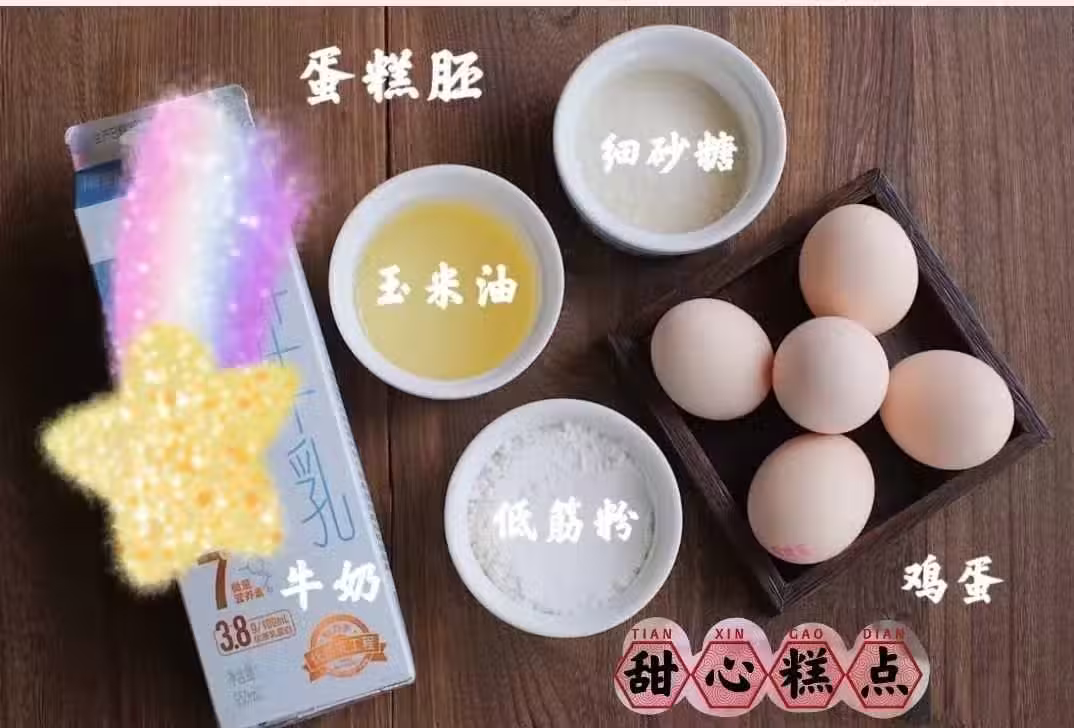 雞蛋5個、玉米油50g、牛奶 50g、低筋粉60g、細砂糖50g