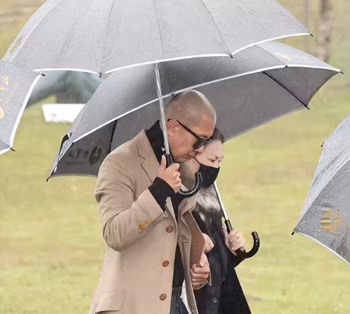就在儀式剛剛開始前的半個小時左右,他們很多很多人都一起現身在了現場,放眼望去基本上全是一身黑色的穿搭,並且基本上全部佩戴了墨鏡,首先映入眼帘的就是具先生穿著一件米色的外套,旁邊的S媽挽著他的手臂,兩個人走在最前方,身後更是跟著許多的好友。