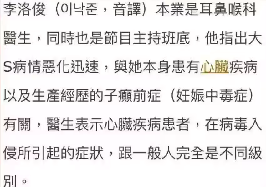 而了解大S的都知道,當初大S跟汪小菲在一起的時候,生二胎的確是非常兇險,據說大S在生產的時候多次昏迷,汪小菲甚至被迫保大棄小,最後也是運氣好,這才幸運母子平安可能就是因為當時長時間的缺氧導致心臟受損,落下許多後遺症,韓國醫生指出:「若患有這類復合性疾病,感冒或流感的初期症狀,都可能迅速惡化為致命的併發症。