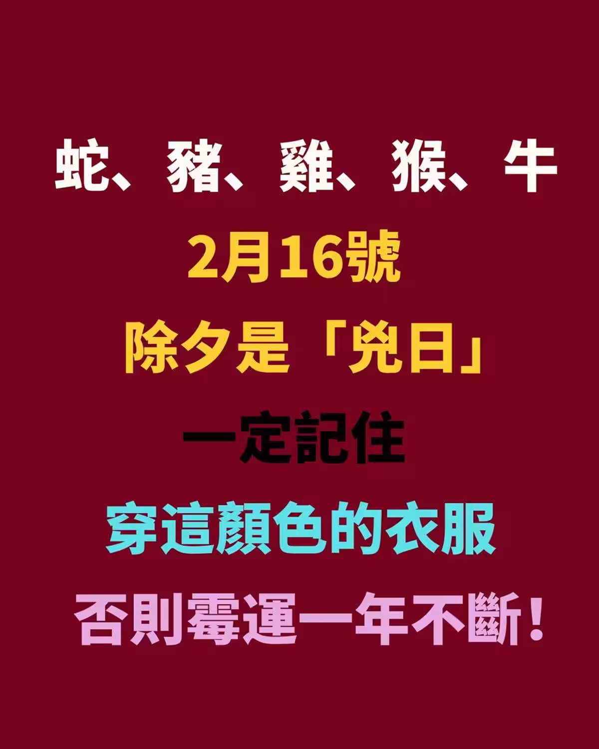 2月16號除夕是「凶日」!!! 生肖蛇、豬、雞、猴、牛, 一定記住穿這顏色, 否則霉運一年不斷
