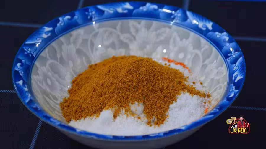 第二步:準備一個較大的面碗,在面碗裡面放入250克食鹽,再放入1包十三香,家裡有條件的還可以放一點辣椒粉,然後用湯匙攪拌均勻備用。