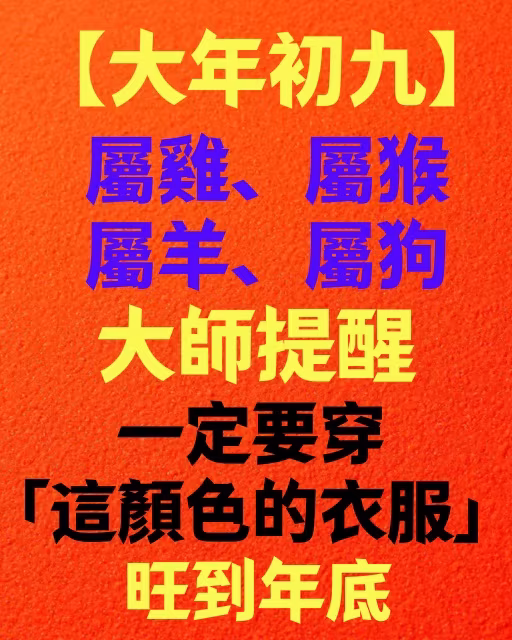 【大年初九】屬雞、屬猴、屬羊、屬狗!!! 大師提醒一定要穿「這顏色的衣服」旺到年底