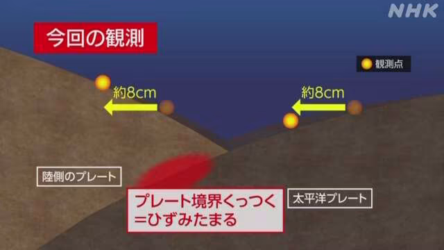 研究團隊直言,海側的板塊每年大約以8公分的速度朝向陸地移動,而設置在陸側板塊、靠近海溝軸的觀測點也同樣每年移動約8公分,代表海側板塊正向下沉入陸側板塊之下,兩者之間緊密黏合,導致能量不斷累積。