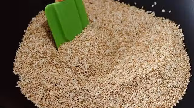2、 芝麻炒好後,準備一口大碗,倒入適量的糯米粉,加入水,用筷子調成糊狀。